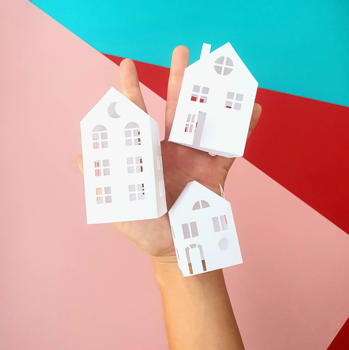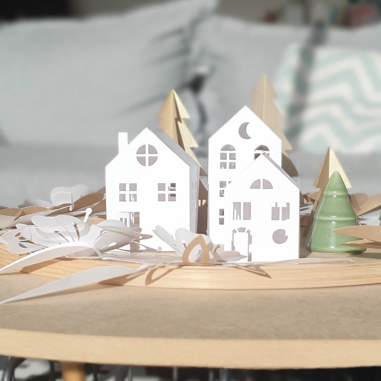 - 3 maisons de tailles différentes, découpées dans un papier de création blanc et écologique (certifié FSC)